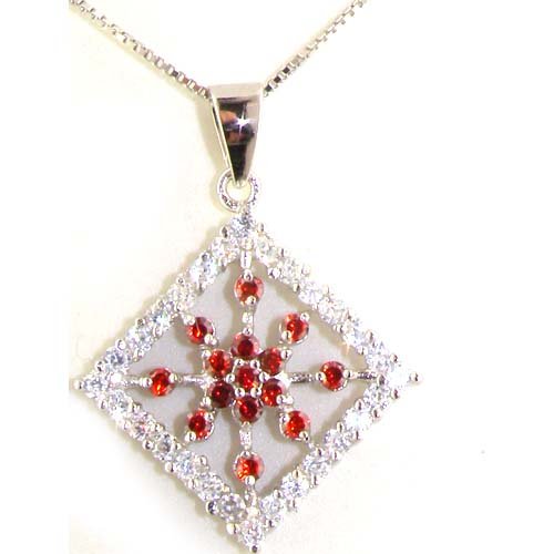 A Very High Quality Solid Sterling Silver Pendant set with an array of Deep Red and Sparkling White High Quality Cubic Zirconia Gemstones, a Stunning piece full of Sparkle. The Pendant comes on a Sterling Silver Box Chain and is presented in a Luxury Velvet style Pendant Box. The Pendant has been Rhodium plated to prevent tarnishing.
