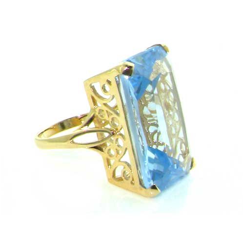 A beautiful Created Aquamarine Ring set with a spectacular size created high quality Aquamarine measuring 25x18mm (1.00x0.72" inches) in a stylish Victorian Style basket setting in solid 14K Yellow Gold.
